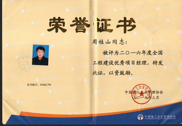 大會表彰了2016年度獲得全國優(yōu)秀施工企業(yè)稱號的單位并頒發(fā)了證書。我公司榮獲“2016年度全國優(yōu)秀施工企業(yè)”稱號,周桂山同志榮獲“全國工程建設優(yōu)秀項目經理”稱號。