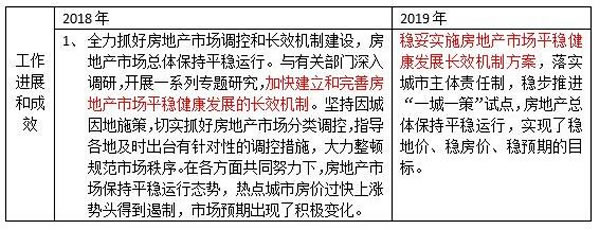 對于2019年的工作進展和成效方面,住建部工作會議指出,穩(wěn)妥實施房地產(chǎn)市場平穩(wěn)健康發(fā)展長效機制方案,落實城市主體責(zé)任制,穩(wěn)步推進“一城一策”試點,房地產(chǎn)總體保持平穩(wěn)運行,實現(xiàn)了穩(wěn)地價、穩(wěn)房價、穩(wěn)預(yù)期的目標。