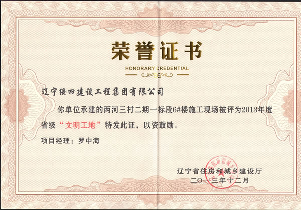2013年12月由羅忠海項(xiàng)目部承建的兩河三村二期一標(biāo)段6#樓施工現(xiàn)場被遼寧省住房和城鄉(xiāng)建設(shè)廳評(píng)為2013年度省級(jí)“文明工地”。