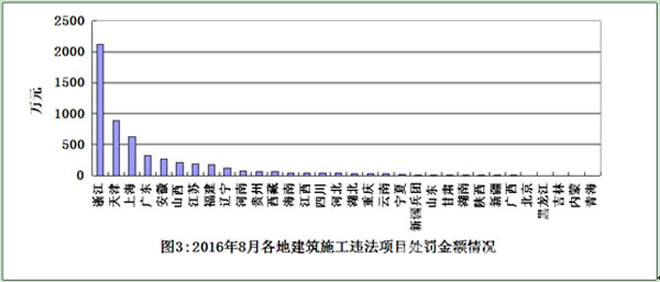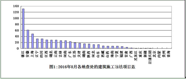 各地查處工作情況。從各地查處的違法工程項(xiàng)目數(shù)量看,浙江、安徽、上海3省(市)查處力度較大,分別查處項(xiàng)目131個(gè)、61個(gè)、48個(gè)(見(jiàn)圖1)。