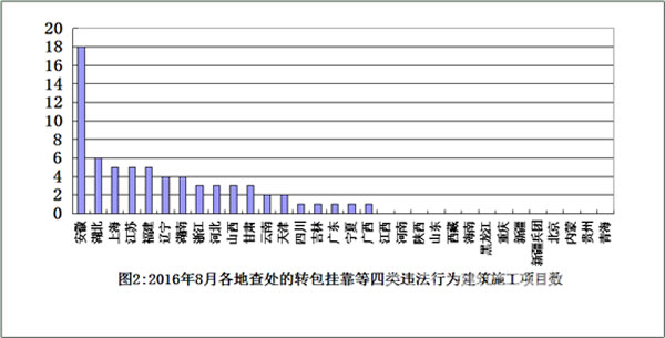 從查處的轉(zhuǎn)包、掛靠等四類違法行為看,安徽、湖北省查處項(xiàng)目相對(duì)較多(見(jiàn)圖2)。